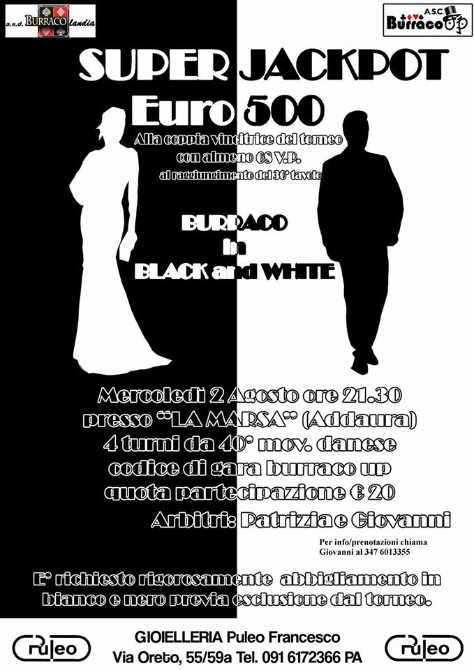 Per la prima volta a Palermo torneo di burraco in BLACK AND WHITE . Mercoledì 2 agosto con inizio alle ore 21:30 presso "La Marsa" all'Addaura torneo di burraco dove tutti i partecipanti, pena l'esclusione dal torneo, dovranno indossare abiti di colore " Bianco e Nero". Quota partecipazione € 20,00. Il torneo si svolgerà in 4 turni da 40' con movimento danese. Regolamento A.S.C. Burraco Up. Arbitri Giovanni e Patrizia.